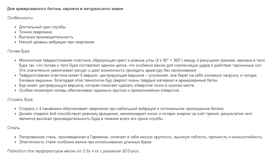 Бур имеет четыре режущие кромки, что гарантирует быстрый результат, вследствии чего снижаются обратные вибрации, а прочные хвостовики помогают выдерживать большие нагрузки. Предназначен для бурения отверстий большого диаметра.